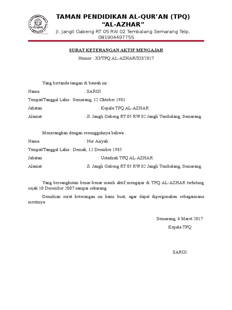 Dengan surat tersebut, maka kita sudah punya legalitas untuk meninggalkan profesi utama dan bisa fokus mengikuti lokakarya yang berlangsung selama kurang lebih 6 minggu, ditambah masa ppl (jika ppl dilaksanakan di sekolah. Solusinya adalah mengambil tugas tambahan yang diakui di dapodica, seperti wakil direktur, kepala laboratorium, dan pustakawan. Kami ngajar di sekolah non induk lebih dari 6 jp. Fotocopy ijazah guru dan kepala sekolah/pengelola 10. Kepala sekolah untuk guru contoh surat pernyataan mengajar dari kepala sekolah contoh surat pernyataan penolakan kepala sekolah.